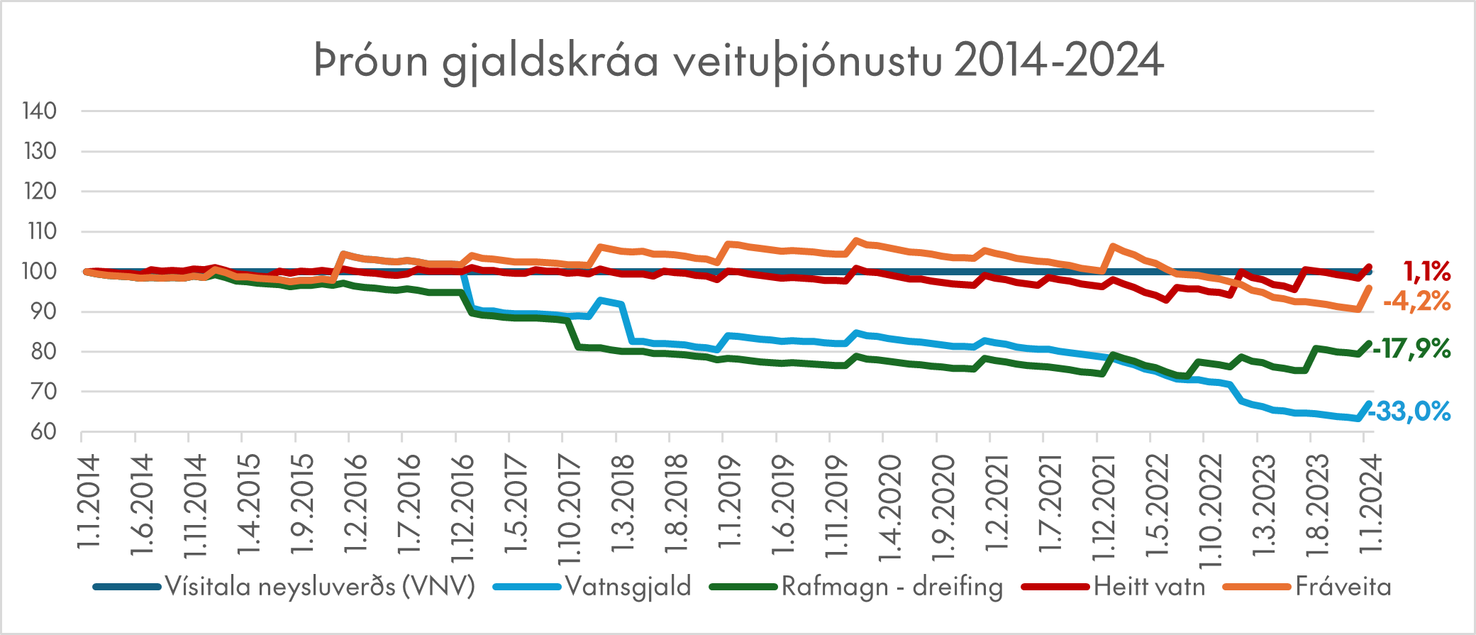 Viðfest línurit sýnir þróun gjaldskrá sérleyfisþjónustu Orkuveitunnar á höfuðborgarsvæðinu, sem Veitur sjá um. Samanlagt hafa gjaldskrárnar lækkað verulega að raungildi frá því uppskipting fyrirtækisins var gerð að lagaskyldu árið 2014. Vísitala neysluverðs er sýnd sem flöt lína og gjaldskrárþróunin frá upphafi árs 2014 miðað við hana.