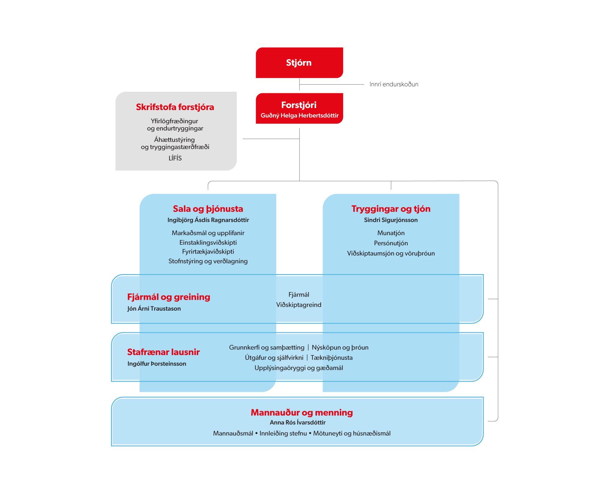 Auk þeirra Ingólfs og Jóns Árna sitja nú í framkvæmdastjórn VÍS trygginga Guðný Helga Herbertsdóttir, forstjóri, Anna Rós Ívarsdóttir, framkvæmdastjóri mannauðs og menningar, Ingibjörg Ásdís Ragnarsdóttir, framkvæmdastjóri sölu- og þjónustu og Sindri Sigurjónsson, framkvæmdastjóri trygginga og tjóna.